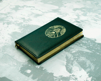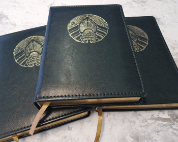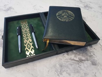 Ежедневник из рециклированной кожи зеленого цвета, формат А5, золоченый срез, герб Республики Беларусь (тиснение золотом).