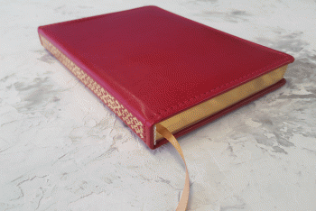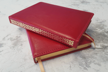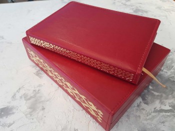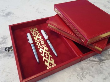 Ежедневник из рециклированной кожи красного цвета, формат А5, золоченый срез. На корешок ежедневника нанесен традиционный орнамент. Тиснение на корешке выполнено золотом.
