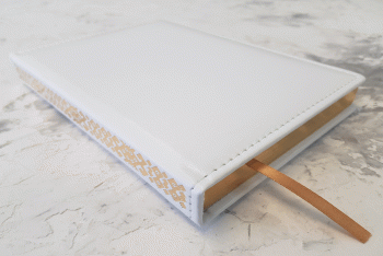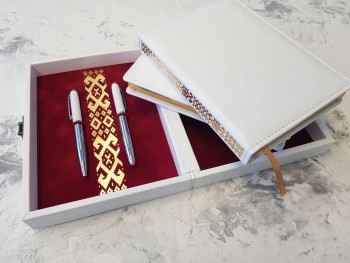 Ежедневник из рециклированной кожи белого цвета, формат А5, золоченый срез. На корешок ежедневника нанесен традиционный орнамент. Тиснение на корешке выполнено золотом.