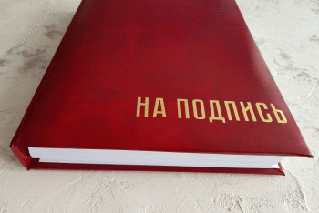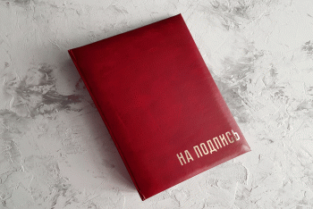 Папка ― НА ПОДПИСЬ, бордового цвета,тиснение в золоте, имеет широкий твердый корешок 40 мм. Внутреннее исполнение (оклейка белой бумагой).