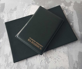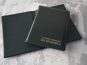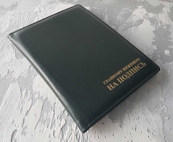 Папка НА ПОДПИСЬ ГЛАВНОМУ ИНЖЕНЕРУ зеленого цвета, формата А4, тиснение в золоте (возможно тиснение серебром, а также без цвета), имеет широкий корешок 40 мм. Возможно изготовление корешков разной ширины с шагом в один сантиметр — 2, 3, 4, 5, 6, 7, 8, 9, 10 см. (При заказе ширины корешка свыше 10см подробности уточняйте у менеджеров компании).