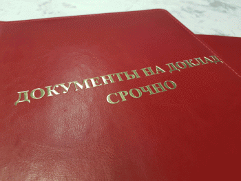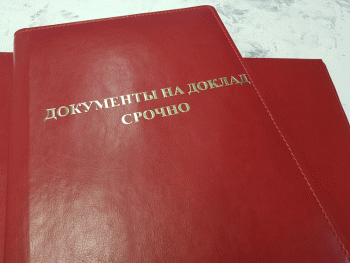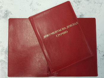Папка ДОКУМЕНТЫ НА ДОКЛАД СРОЧНО красного цвета, формата А4, тиснение в золоте (возможно тиснение серебром, а также без цвета), имеет широкий корешок 40 мм. Возможно изготовление корешков разной ширины с шагом в один сантиметр — 2, 3, 4, 5, 6, 7, 8, 9, 10 см. (При заказе ширины корешка свыше 10см подробности уточняйте у менеджеров компании).