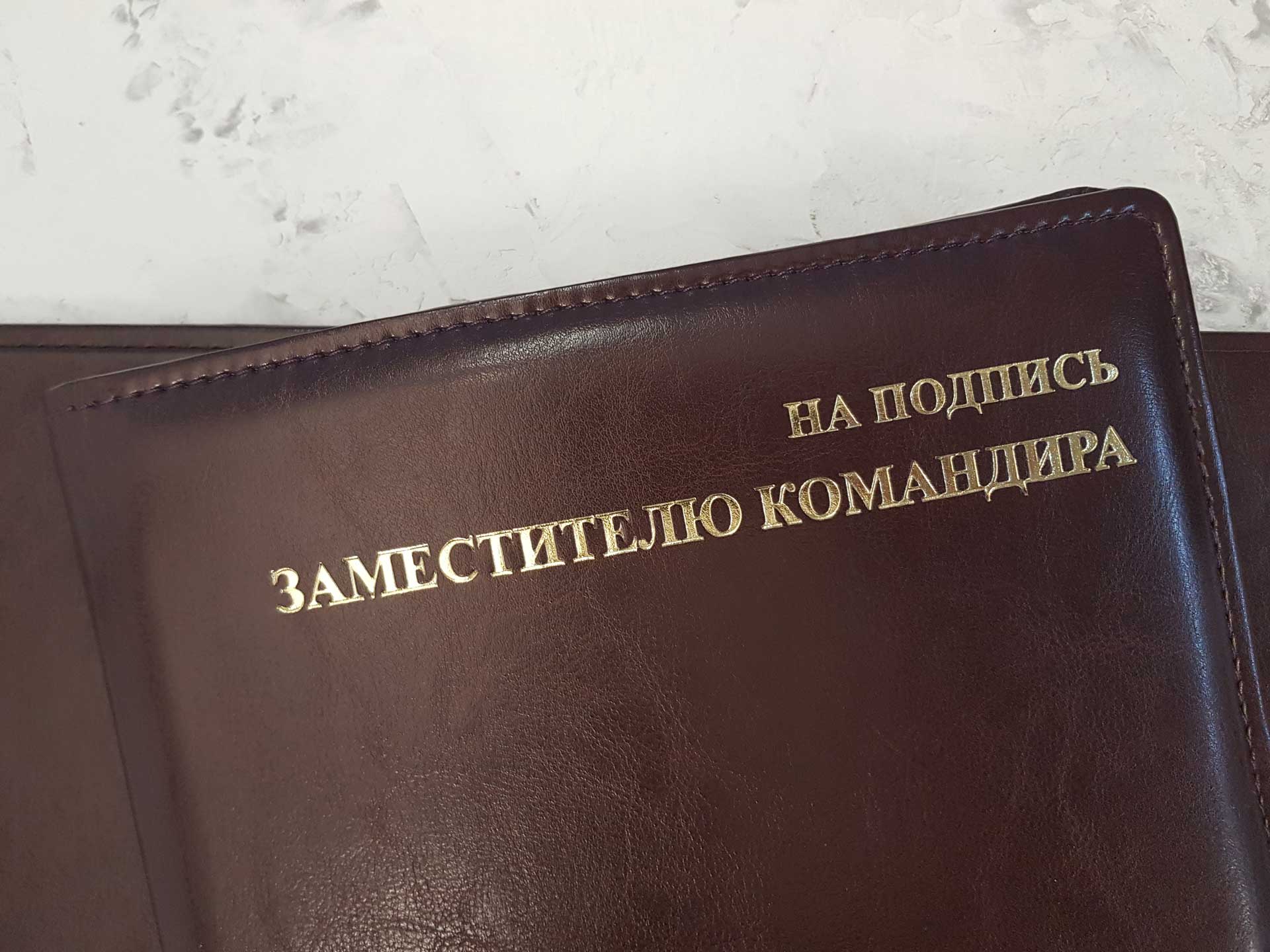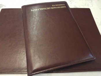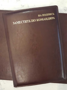 Папка НА ПОДПИСЬ ЗАМЕСТИТЕЛЮ КОМАНДИРА коричневого цвета, формата А4, тиснение в золоте (возможно тиснение серебром, а также без цвета), имеет широкий корешок 40 мм. Возможно изготовление корешков разной ширины с шагом в один сантиметр — 2, 3, 4, 5, 6, 7, 8, 9, 10 см. (При заказе ширины корешка свыше 10см подробности уточняйте у менеджеров компании).