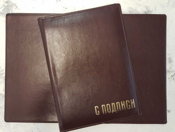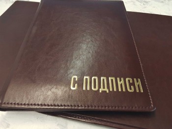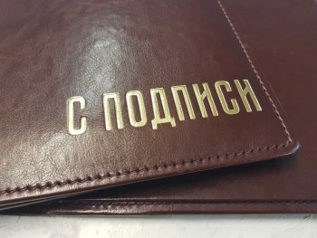 Папка С ПОДПИСИ коричневого цвета, формата А4, тиснение в золоте (возможно тиснение серебром, а также без цвета), имеет широкий корешок 40 мм. Возможно изготовление корешков разной ширины с шагом в один сантиметр — 2, 3, 4, 5, 6, 7, 8, 9, 10 см. (При заказе ширины корешка свыше 10см подробности уточняйте у менеджеров компании).