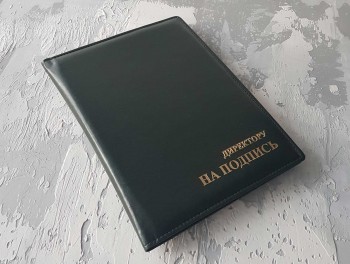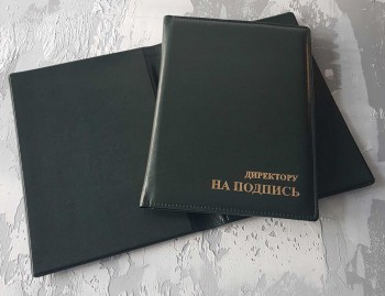 Папка НА ПОДПИСЬ ДИРЕКТОРУ зеленого цвета, формата А4, тиснение в золоте (возможно тиснение серебром, а также без цвета), имеет широкий корешок 40 мм. Возможно изготовление корешков разной ширины с шагом в один сантиметр — 2, 3, 4, 5, 6, 7, 8, 9, 10 см. (При заказе ширины корешка свыше 10см подробности уточняйте у менеджеров компании).