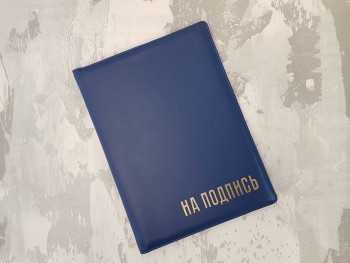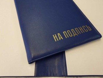 Папка на подпись синего цвета, имеет широкий корешок 80мм. Возможно изготовление корешков разной ширины с шагом в один сантиметр — 2, 3, 4, 5, 6, 7, 8, 9, 10 см. (При заказе ширины корешка свыше 10см подробности уточняйте у менеджеров компании). Возможно тиснение серебром, золотом, а также без цвета. С внешней стороны папка выполнена из искусственной кожи, внутреннее исполнение - мелованный картон белого цвета.