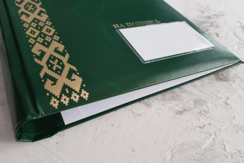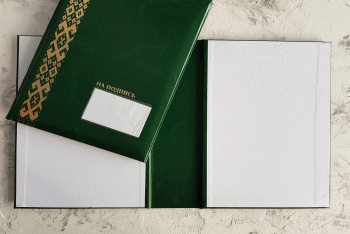 Папка НА ПОДПИСЬ, с карманом, зеленого цвета,тиснение в золоте, имеет широкий мягкий корешок 80 мм. Возможно изготовление корешков разной ширины с шагом в один сантиметр — 2, 3, 4, 5, 6, 7, 8, 9, 10 см. (При заказе ширины корешка свыше 10см подробности уточняйте у менеджеров компании). Внутреннее исполнение (оклейка белой бумагой).