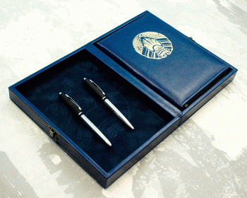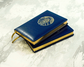 На обложку ежедневника может быть нанесен герб Республики Беларусь, на корешок - традиционный белорусский орнамент. Тиснение на обложке и корешке выполненяется золотом. По желанию наносим любую информацию или логотип, делаем полное брендирование подарочного набора.