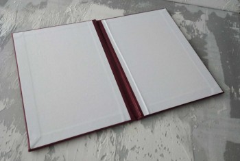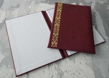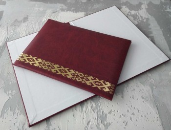 Папка адресная бордового цвета из бумвинила. Орнамент оттиснен золотом. Внутреннее исполнение (оклейка белой бумагой).