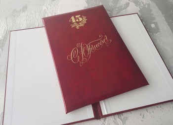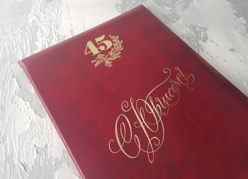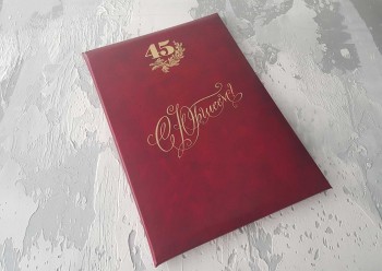 Папка поздравительная из бумвинила бордового цвета. Надпись С Юбилеем! 45 оттеснены золотом. Внутреннее исполнение оклейка белой бумагой.