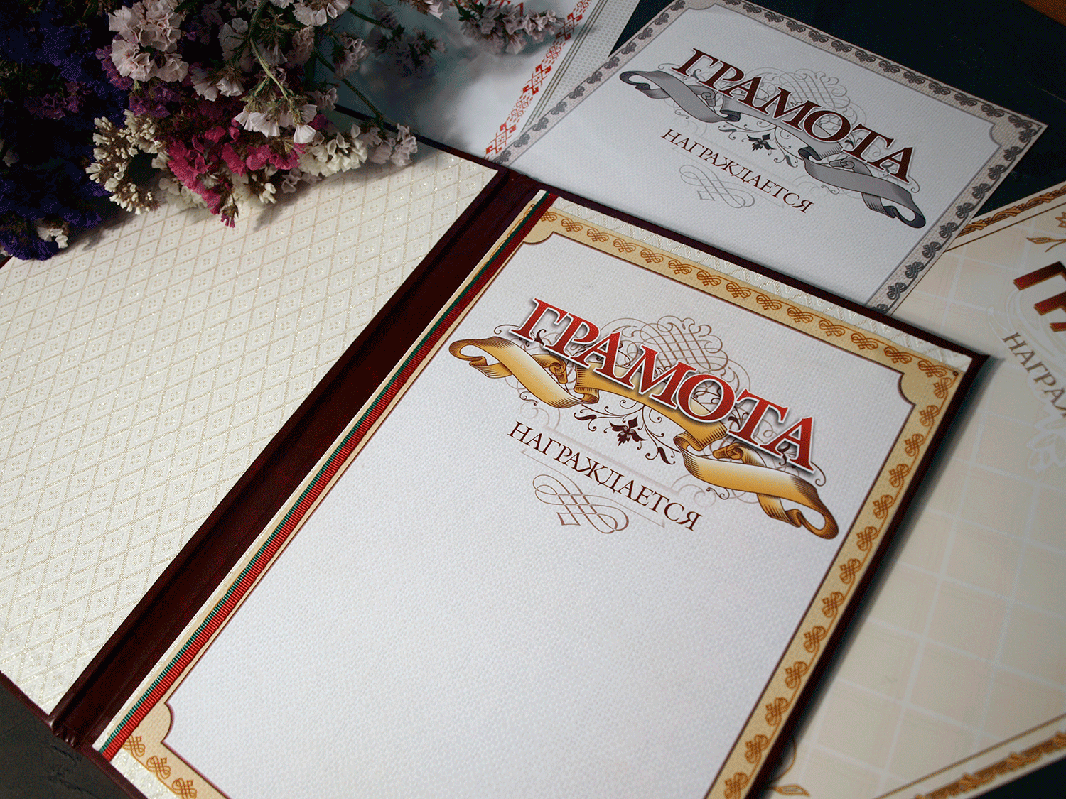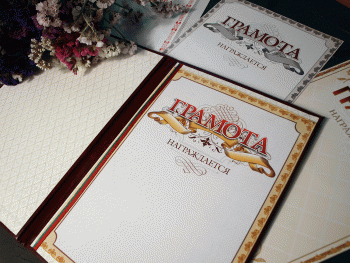Папка поздравительная из бумвинила бордового цвета. Герб оттиснен золотом. Внутреннее исполнение в позолоте.
