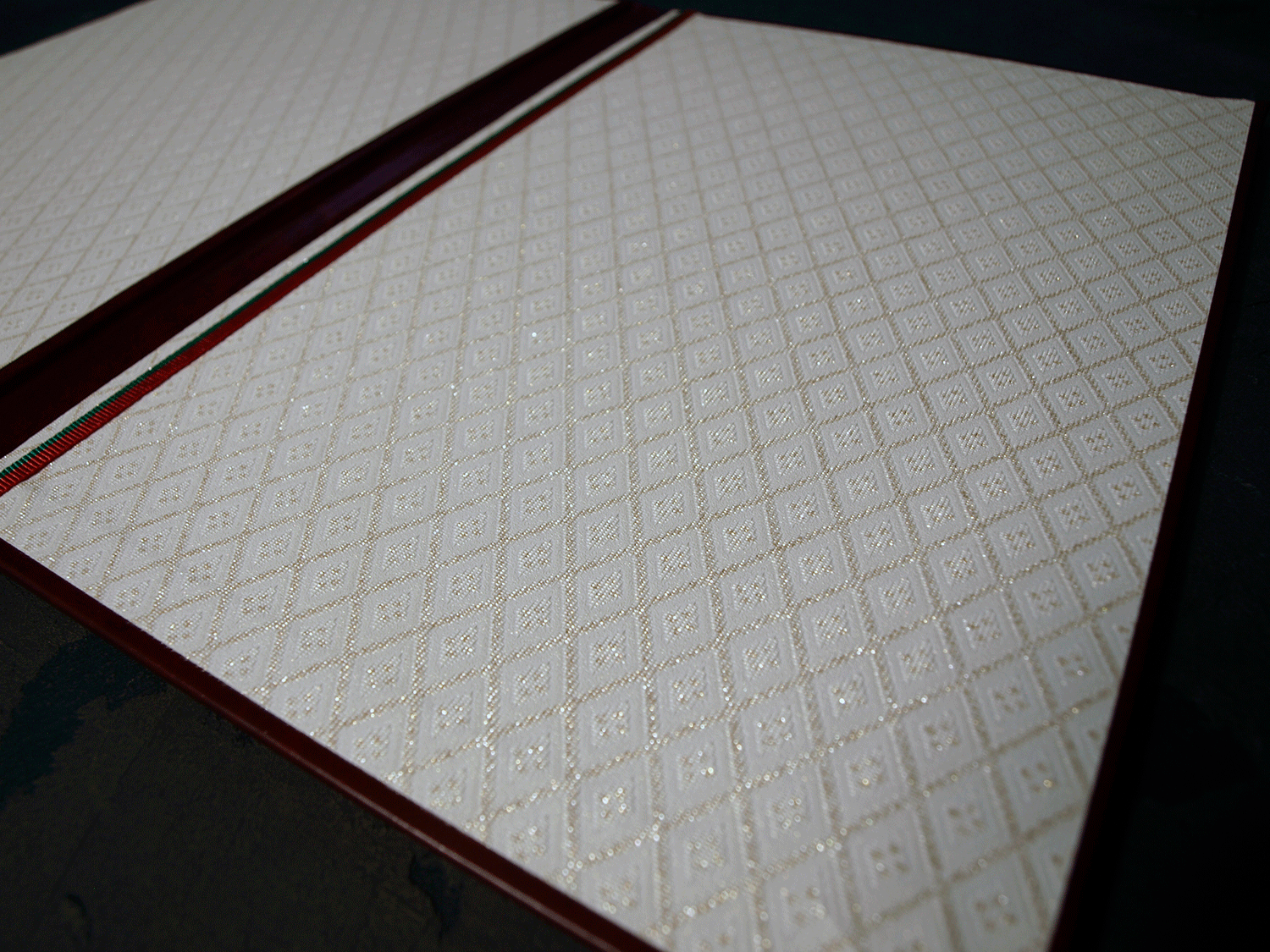 Папка адресная из бумвинила бордового цвета. Герб и орнамент оттиснены золотом. Внутреннее исполнение в позолоте.