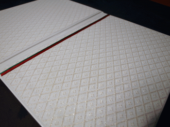 Папка адресная белого цвета из бумвинила. Герб и орнамент оттиснены золотом. Внутреннее исполнение в позолоте.