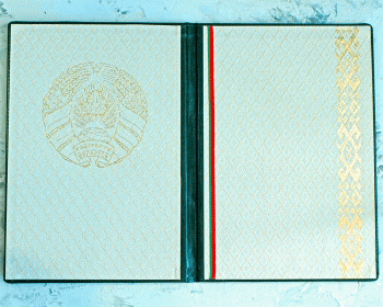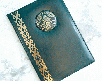 Папка адресная ЗЕЛЕНОГО цвета. Выполнена из качественной искусственной кожи. Орнамент оттиснен золотом, декоративная нашивка, тисненая гербом Республики Беларусь. Внутри оклейка дизайнерским материалом с нанесением герба и орнамента в позолоте (по желанию заказчика).