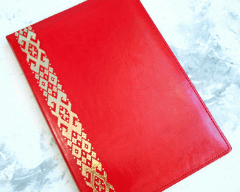 Папка адресная КРАСНОГО цвета. Выполнена из качественной искусственной кожи. Орнамент оттиснен золотом. Внутри оклейка дизайнерским материалом.